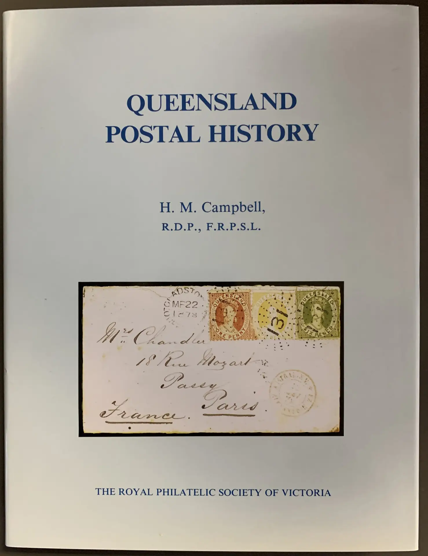 The book is divided into two roughly equal sections. The first covers the postal history, beginning with the days of the Moreton Bay District under New South Wales administration. The history of the more than 700 post offices that operated in Queensland between 1860 and 1913 is told against the background of the evolving pattern of numeral obliterators and datestamps. Special services are comprehensively treated – travelling post offices, registration, late fees and postage due. A chapter on postal rates gives all currently available information and is supplemented by a 29-page Appendix covering the overseas letter rates, country by country, in the complex 1860-91 period.